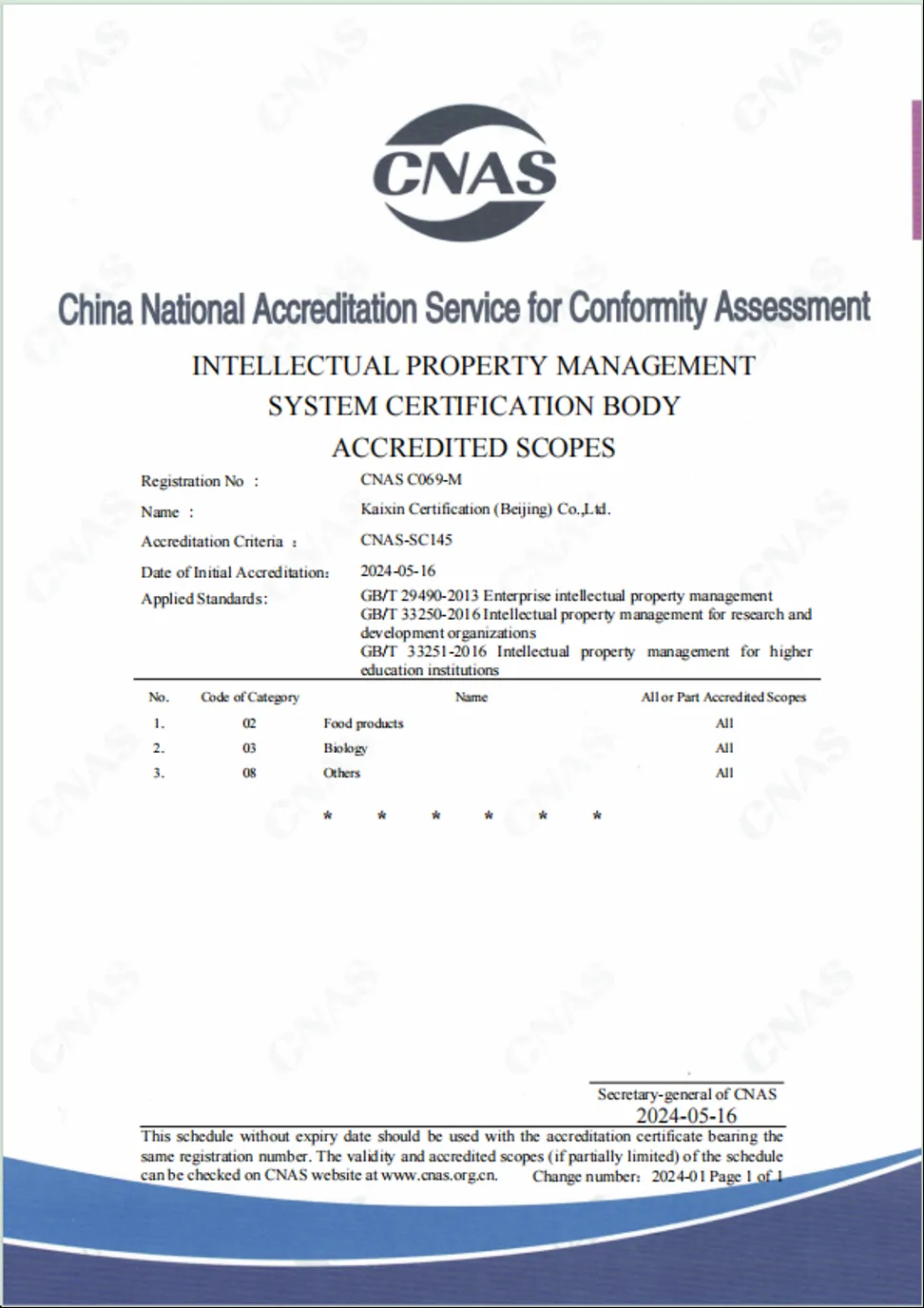 凱新認證知識產(chǎn)權(quán)管理體系(IPMS)于近日獲得CNAS認可資格,凱新認證在被認可的范圍內(nèi),可向客戶發(fā)放帶有CNAS認可標識的認證證書302024-05